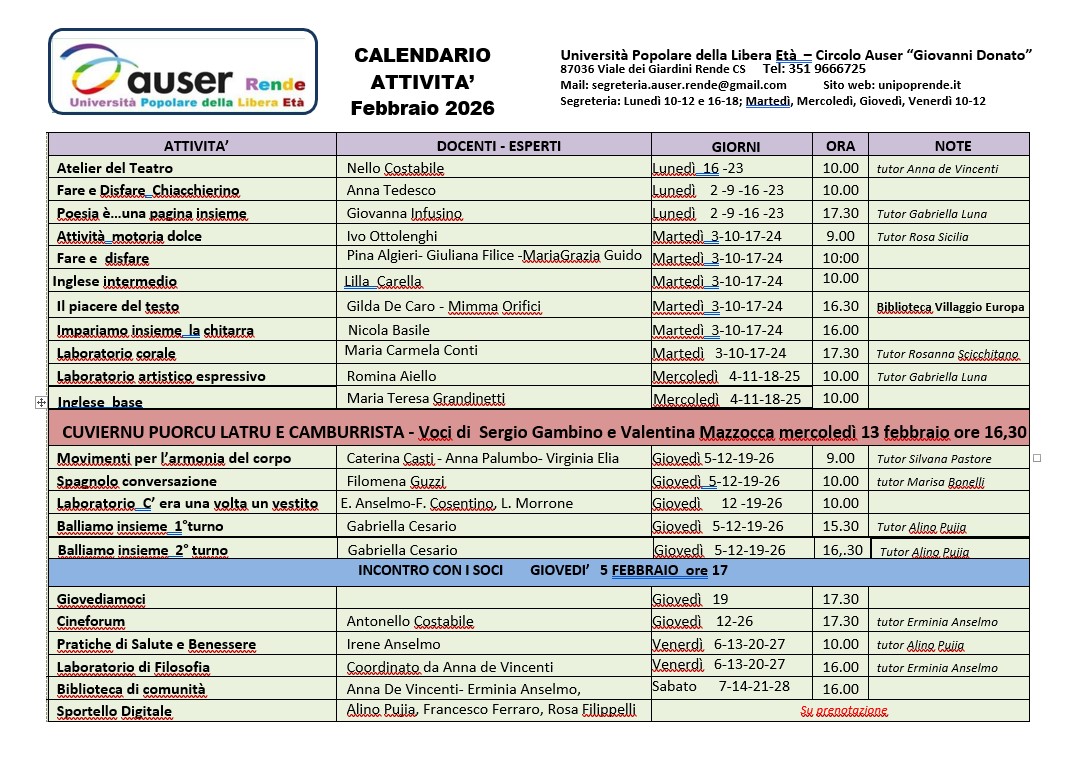 E' stato firmato un protocollo d'intesa tra il Conservatorio di Musica "Stanislao Giacomantonio" di Cosenza e l'Università popolare della libera età di Rende. Per favorire l'ascolto dal vivo della musica, quasi a toccare con mano l'esperienza del suono che rigenera la capacità di ascolto trasferibile anche nell'ambito della vita sociale e che riduce la distanza tra chi la musica la fa e chi la recepisce, L'idea di abbinare la musica ad alcune attività dell'Università Popolare sarà una opportunità in più per i soci Auser di avvicinarsi alla musica e vivere esperienze emozionanti.